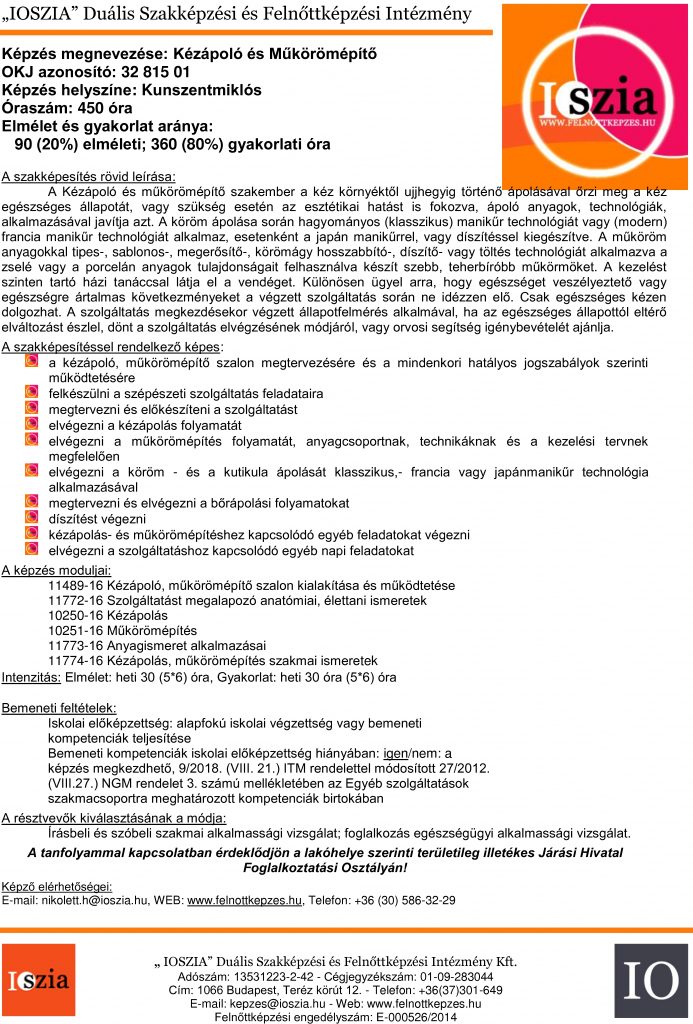 - 11774-16 Kézápolás, műkörömépítés szakmai ismeretek